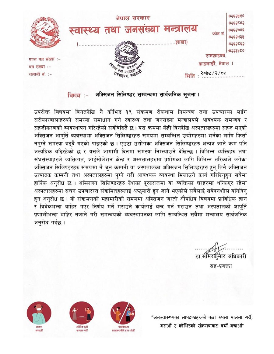 मन्त्रालयले आज एक सूचना जारी गर्दै व्यक्तिगत, संस्थागत, आइसोलेशन केन्द्र र अस्पतालमा प्रयोगका लागि लगिएका सिलिण्डर जुन कम्पनी वा अस्पतालको हो उसैलाई फिर्ता गर्न अनुरोध गरेका छन् ।